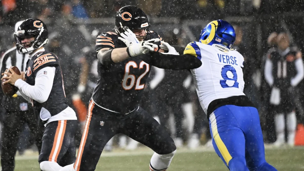 The left tackle position was a disaster zone for Chicago due to injuries. Braxton Jones and Theo Benedet struggled, and the position became a revolving door. When it mattered most, in the Divisional Round against the Rams, Thuney kicked out to play Left Tackle against rookie sensation and Pro Bowler Jared Verse.