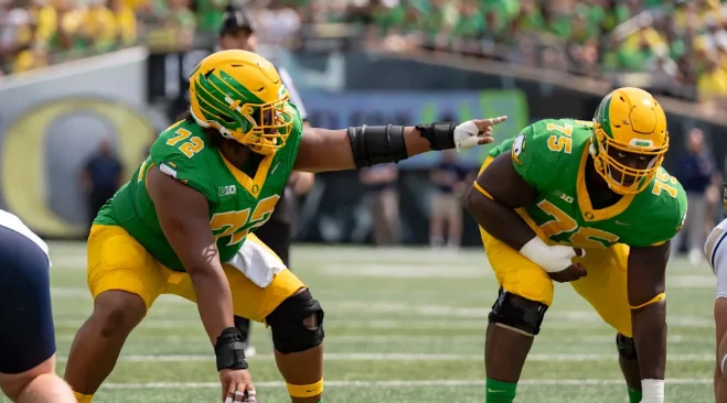 The exodus of Austin Corbett and Brady Christensen left a crater in the interior line. Enter Emmanuel Pregnon. The Oregon mauler (6’5″, 320 lbs) is a violent interior presence who didn’t allow a single sack during the Ducks’ 2025 campaign. While he lacks center experience, his anchor in pass protection is exactly what this pocket-collapsing offensive line desperately needs.
